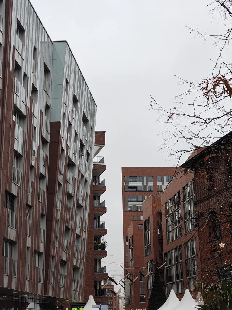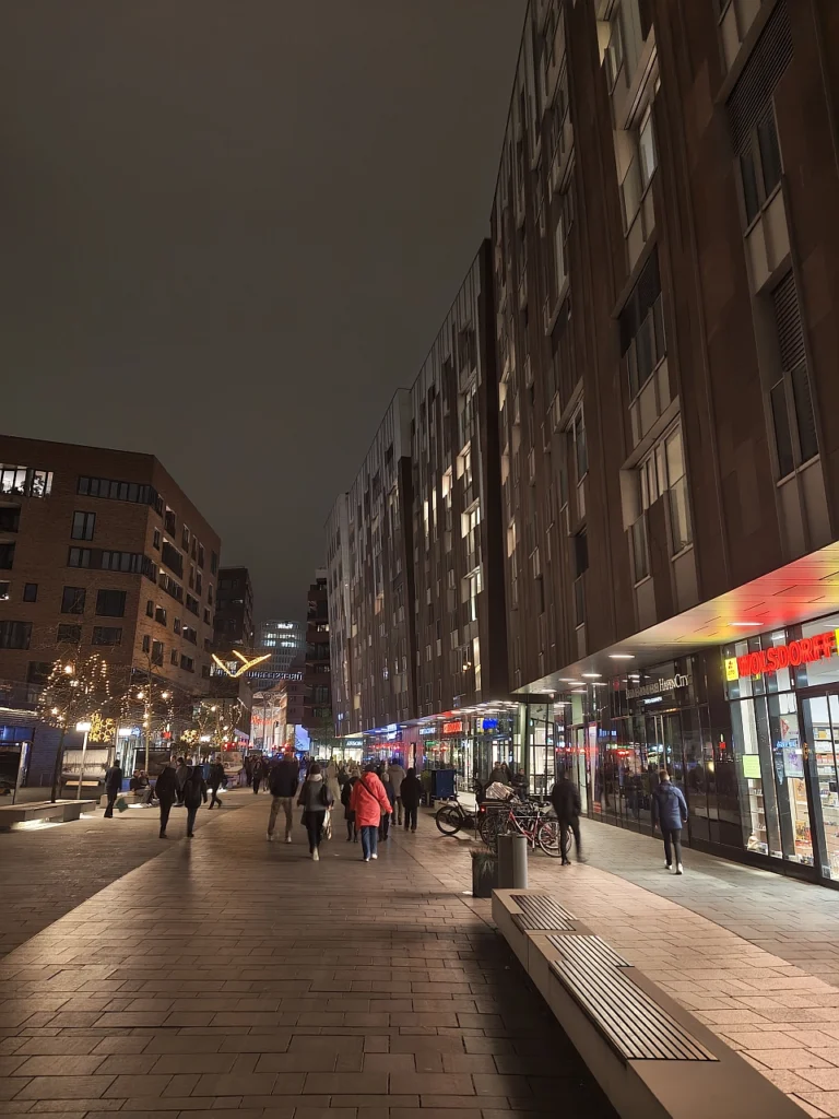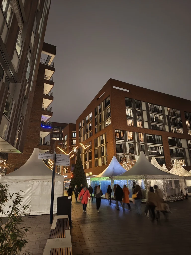 Vom IMMH (Koreastraße/Kaispeicher B) schlendern wir am Wasser zurück in Richtung Überseeboulevard – die Speicher weichen den klaren Kanten der HafenCity, breite Wege, viel Glas, alles aufgeräumt und licht. Auf dem Boulevard gönnen wir uns ein Tiramisu aus dem Supermarkt, setzen uns zwischen Lichterketten und Deko auf eine Bank und lassen die Vorweihnachtsstimmung wirken: belebt, aber angenehm ruhig, genau das richtige Tempo nach dem Museums-Tiefgang.