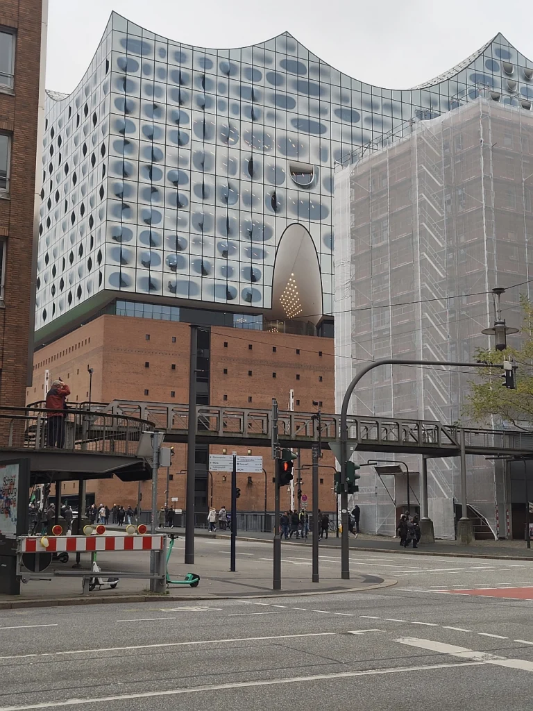 Vom Casa del Burrito (Rambachstraße) rollen wir denselben Weg zurück: Karpfangerstraße hinunter, über den Neustädter Neuen Weg zur Jan-Fedder-Promenade und weiter über die Niederbaumbrücke. Links begleitet uns die Elbphilharmonie (Kaispeicher A) als gläserner Fixpunkt, rechts schaukeln Barkassen im Hafen; Möwen, Wind und eine Prise Salzgeruch erledigen den Rest der Kulisse.