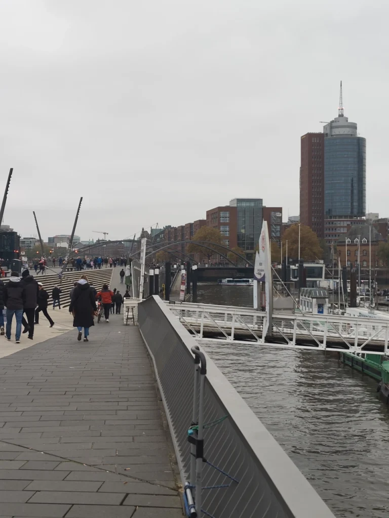 Hinter der Brücke taucht wieder die Speicherstadt auf: Klinker, genietete Stahlbrücken, enge Fleete. Wir passieren das Miniatur Wunderland (Eingang, ein paar kurze Schlangen, klassischer Fotopunkt), folgen der Achse Am Sandtorkai und queren hinüber in die HafenCity. Hier kippt die Szenerie spürbar: breite Warftkanten, Glas und Beton, klare Raster, Plätze statt Höfe – der Maßstab wird größer, die Linien strenger.