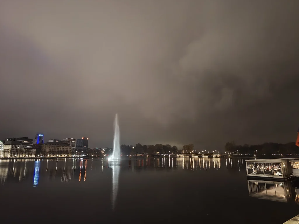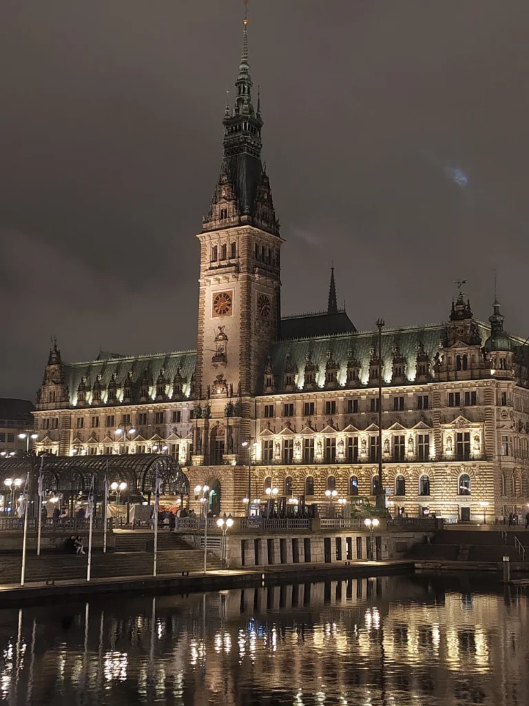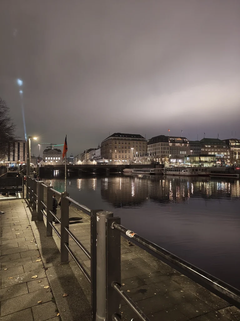 Am Jungfernstieg steigen wir Richtung Ballindamm aus. Vor uns die beleuchtete Alsterfontäne, das Wasser spiegelt die Lichter wie Glas – ein kurzer Postkartenmoment. Wir ziehen weiter durch die Alsterarkaden, unter den Bögen entlang der Kleinen Alster, über Rathausschleuse/Schleusenbrücke bis zum Rathausmarkt. Schön, weit, feierlich – und dann trifft uns die Kälte wie ein Signal: genug draußen für heute. Also zurück zum Jungfernstieg und mit U-/S-Bahn in 1–2 Stationen zum Hauptbahnhof. Ein schneller, glänzender Abendabdruck, genau richtig dosiert.