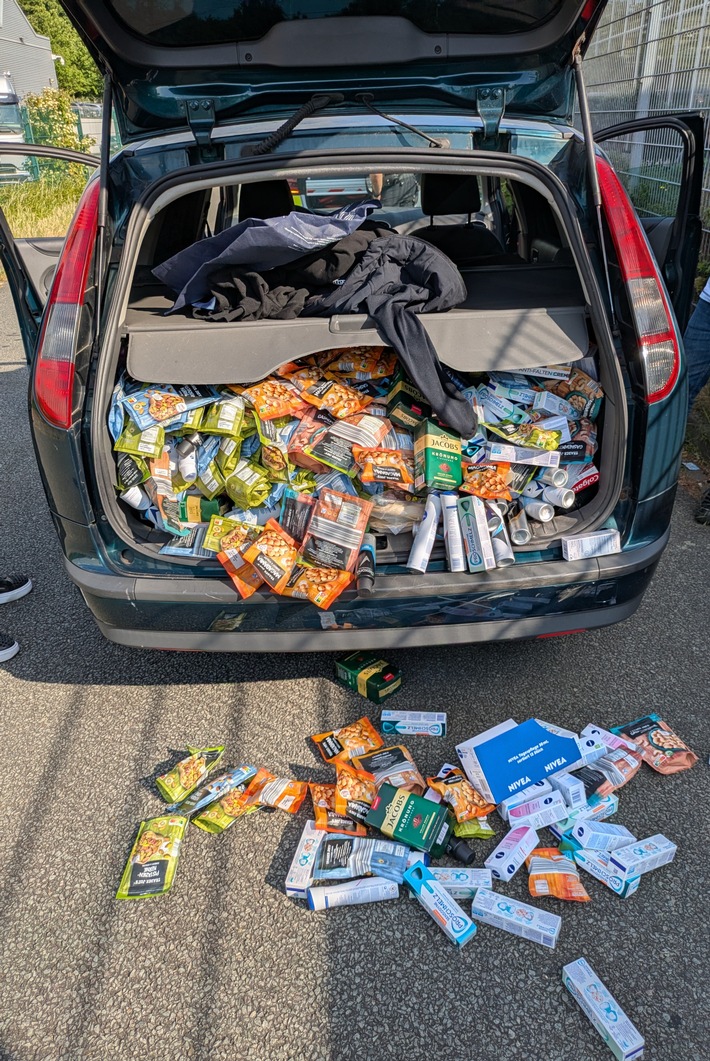 Im Wagen befanden sich zwei Männer im Alter von 19 und 25 Jahren, die keinen festen Wohnsitz in Deutschland haben. Beim Öffnen des Kofferraums entdeckten die Beamten zahlreiche Lebensmittel, Kaffeeprodukte und Kosmetika – ein Teil der Waren fiel sogar beim Öffnen direkt aus dem Fahrzeug.